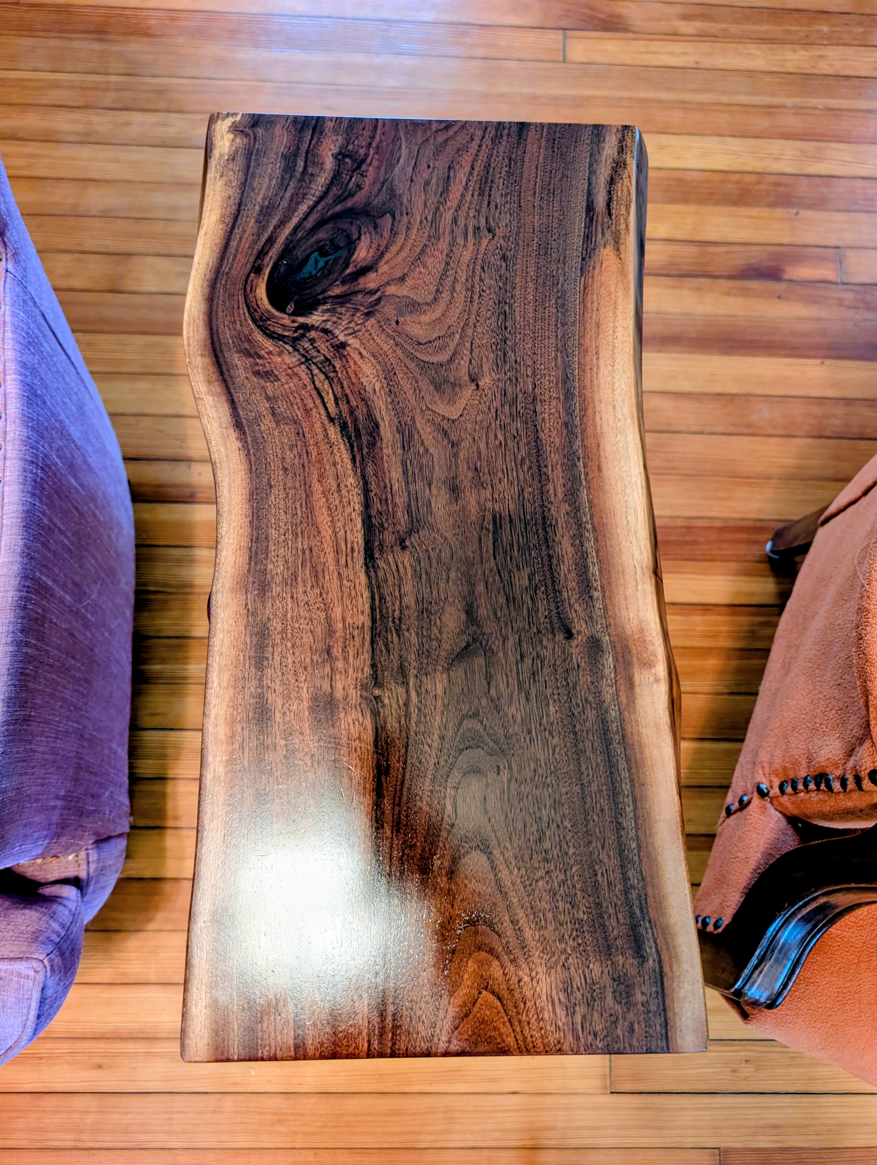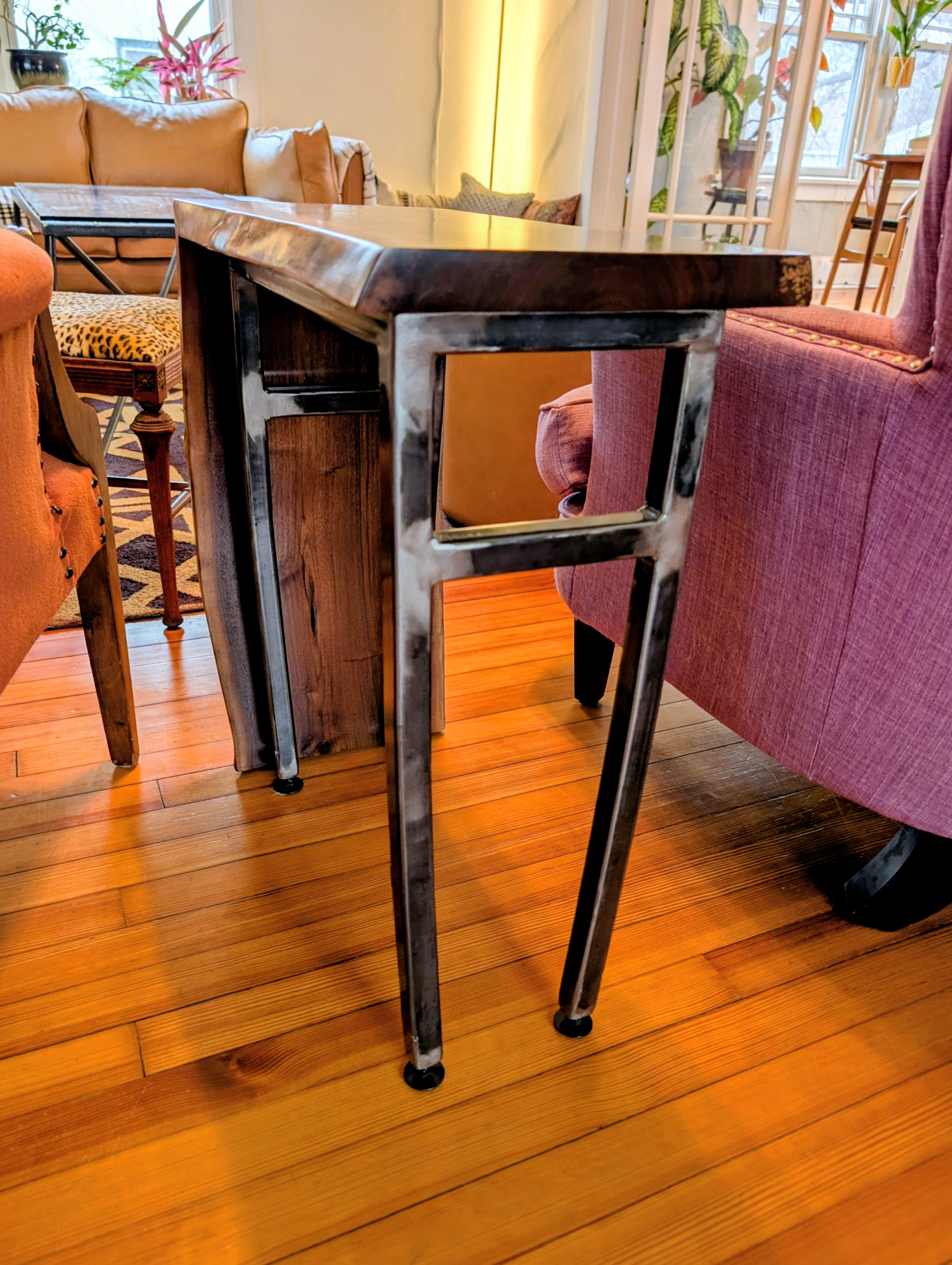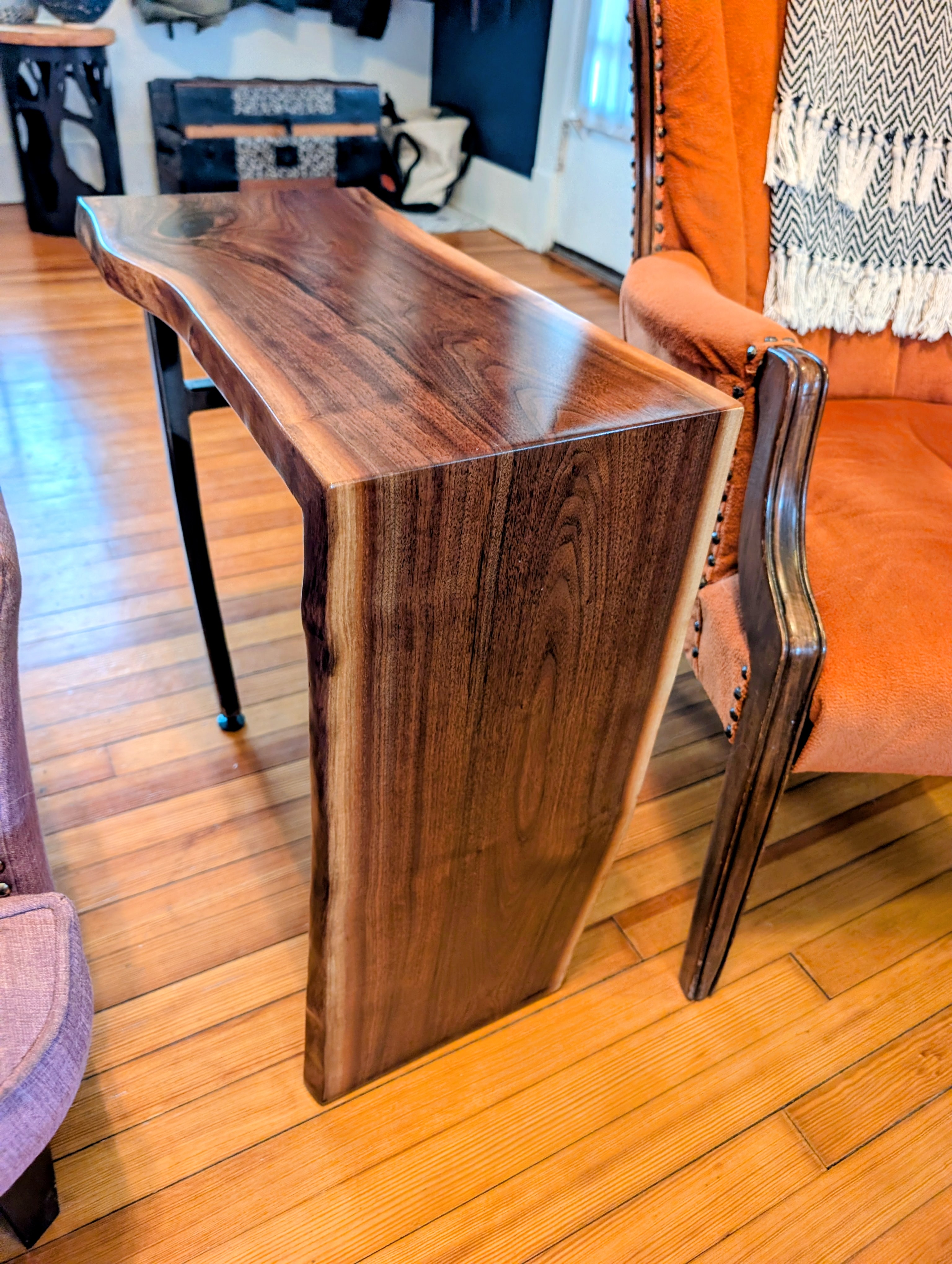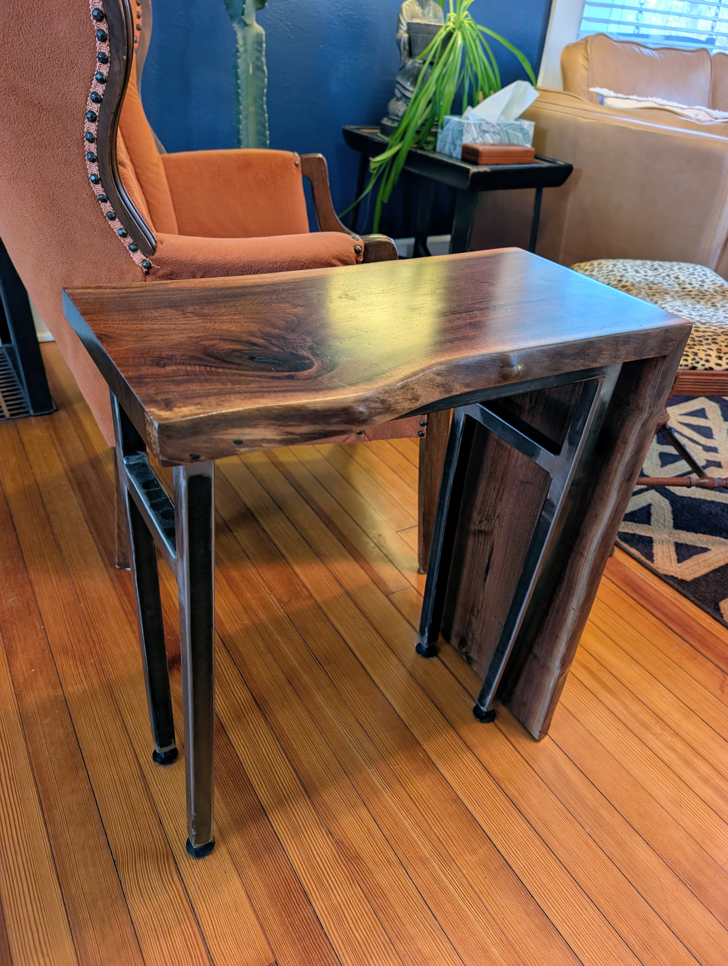 The Waterfall Side Table is a beautiful merger of steel and wood. The cascading walnut top gives the wooden grain movement all the way to the floor. The 1" square tube steel frame work has slightly bent legs to also provide a nonlinear quality which is our signature at FFM.
