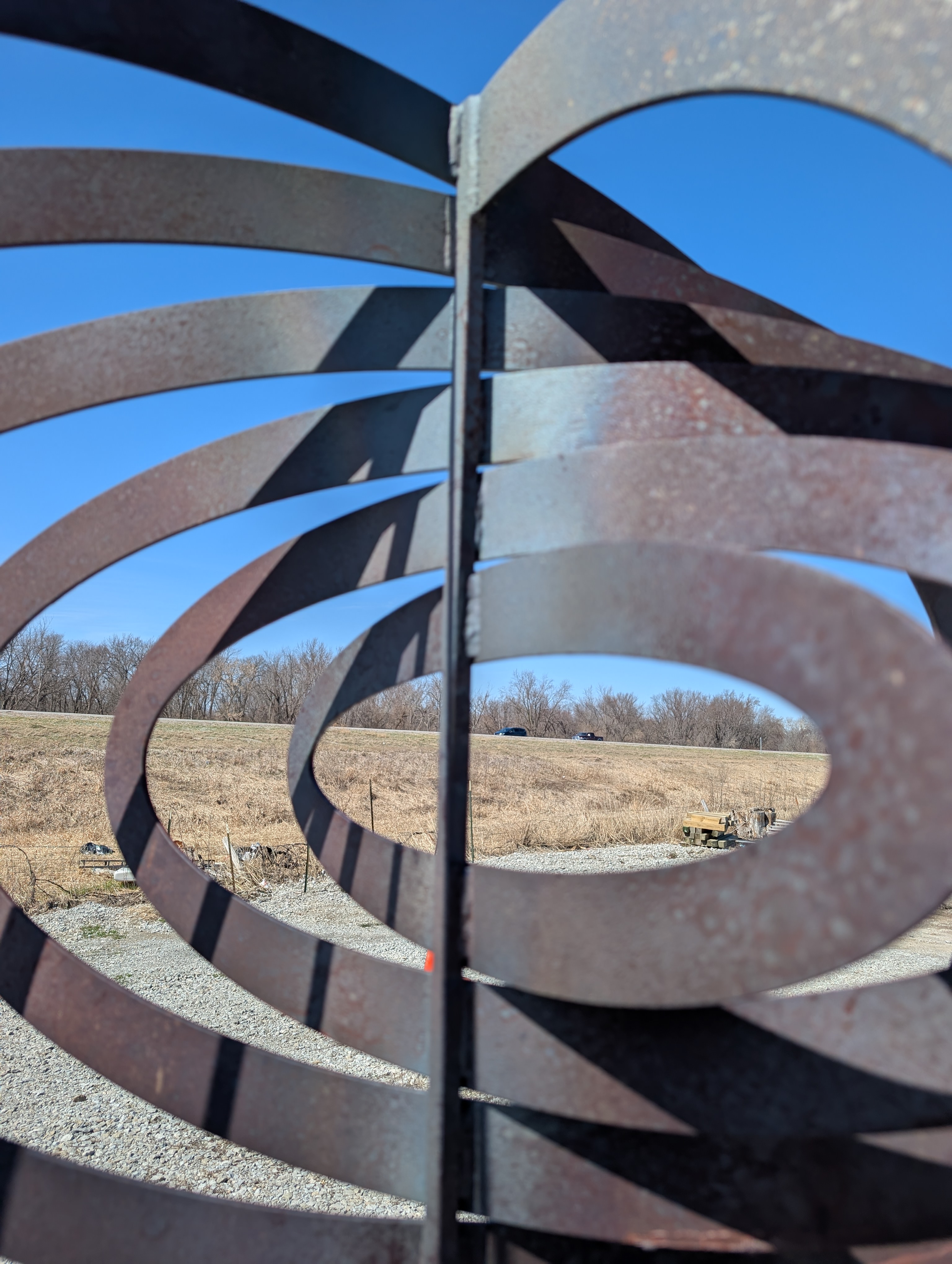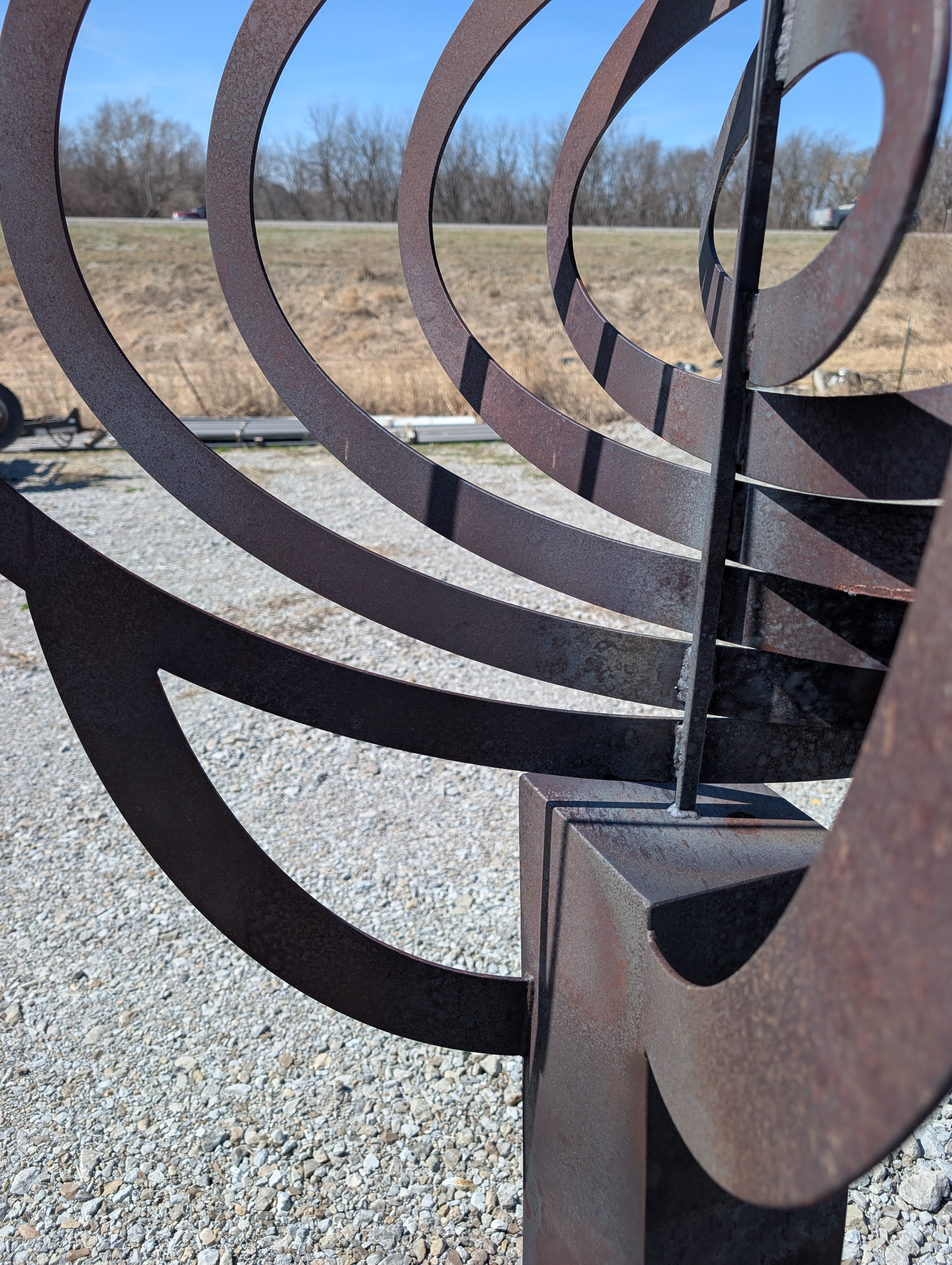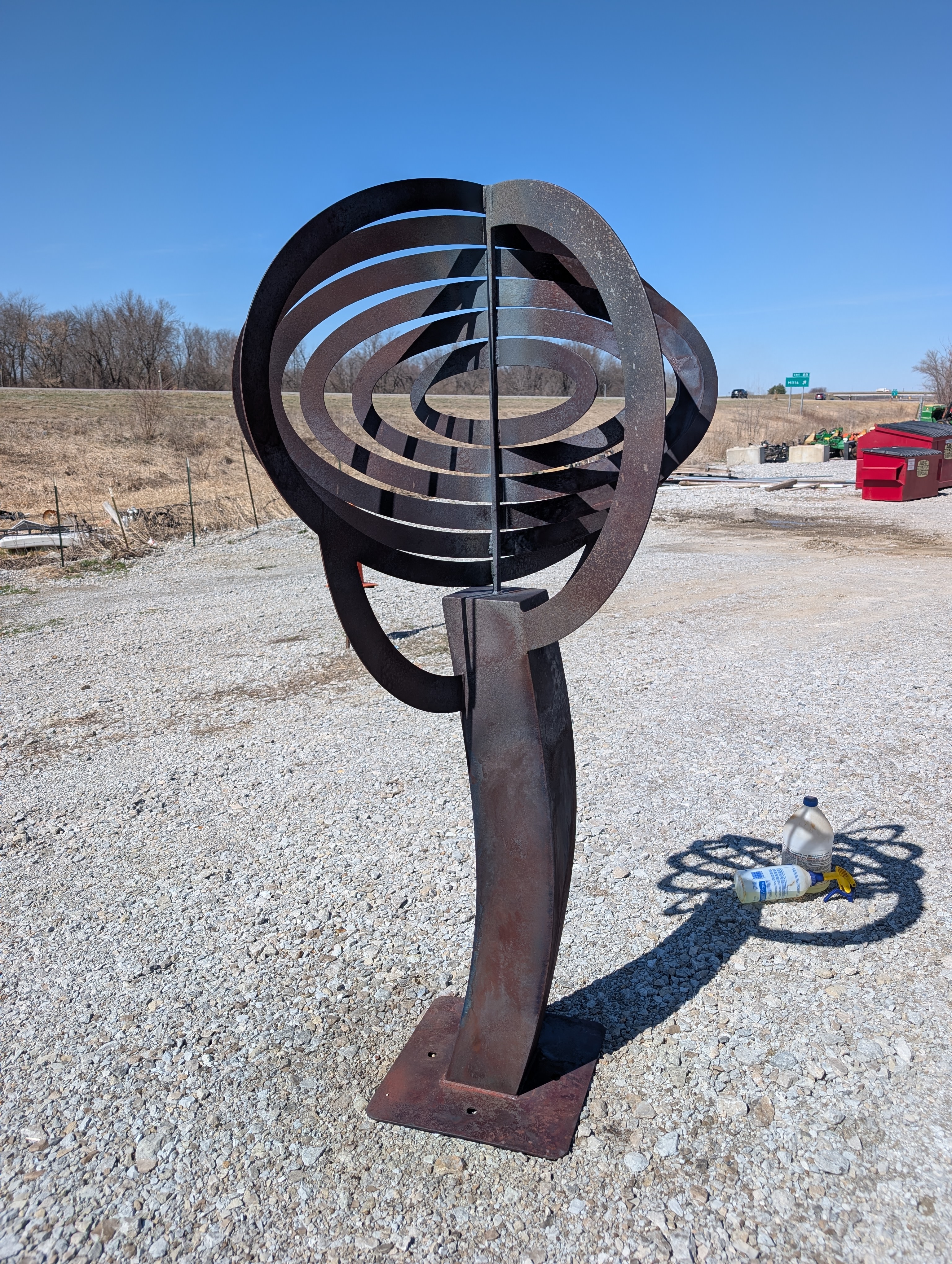 Sandblasted and patinaed to give a full rusted finish. Orbital[1] was then clear coated with a two part epoxy for full durability and definition. A rubber pad is glued to the base. Orbital[1] is great feature in any yard, lawn, or garden. Best to be anchored to a concrete pad that is 3-4' in diameter with concrete wedge anchors. (4) 3/4" holes are drilled in the base to accommodate for these anchors. Orbital[1] is currently on exhibit at the Czech Village Rotating Sculpture Park. Available July 2027.