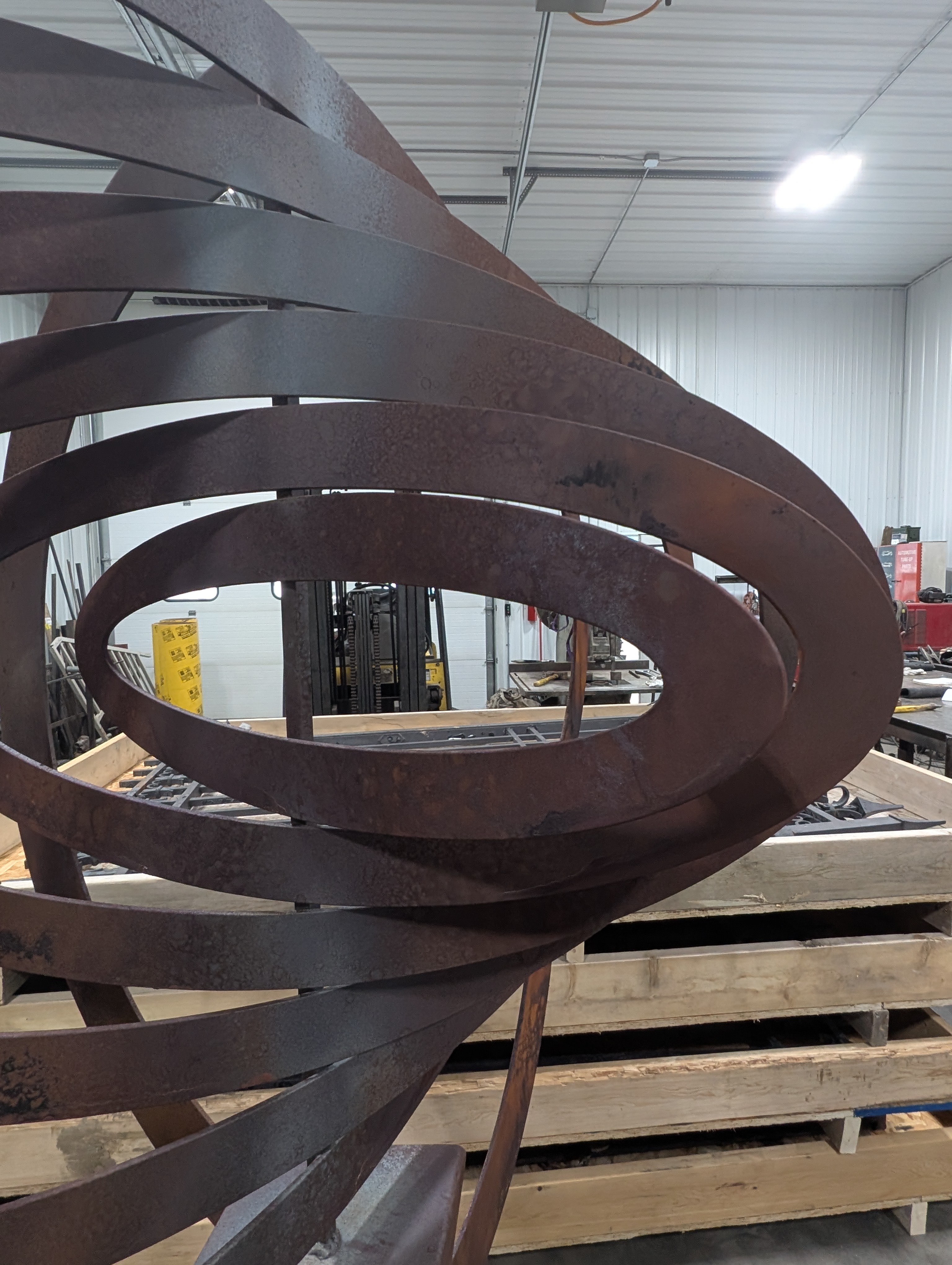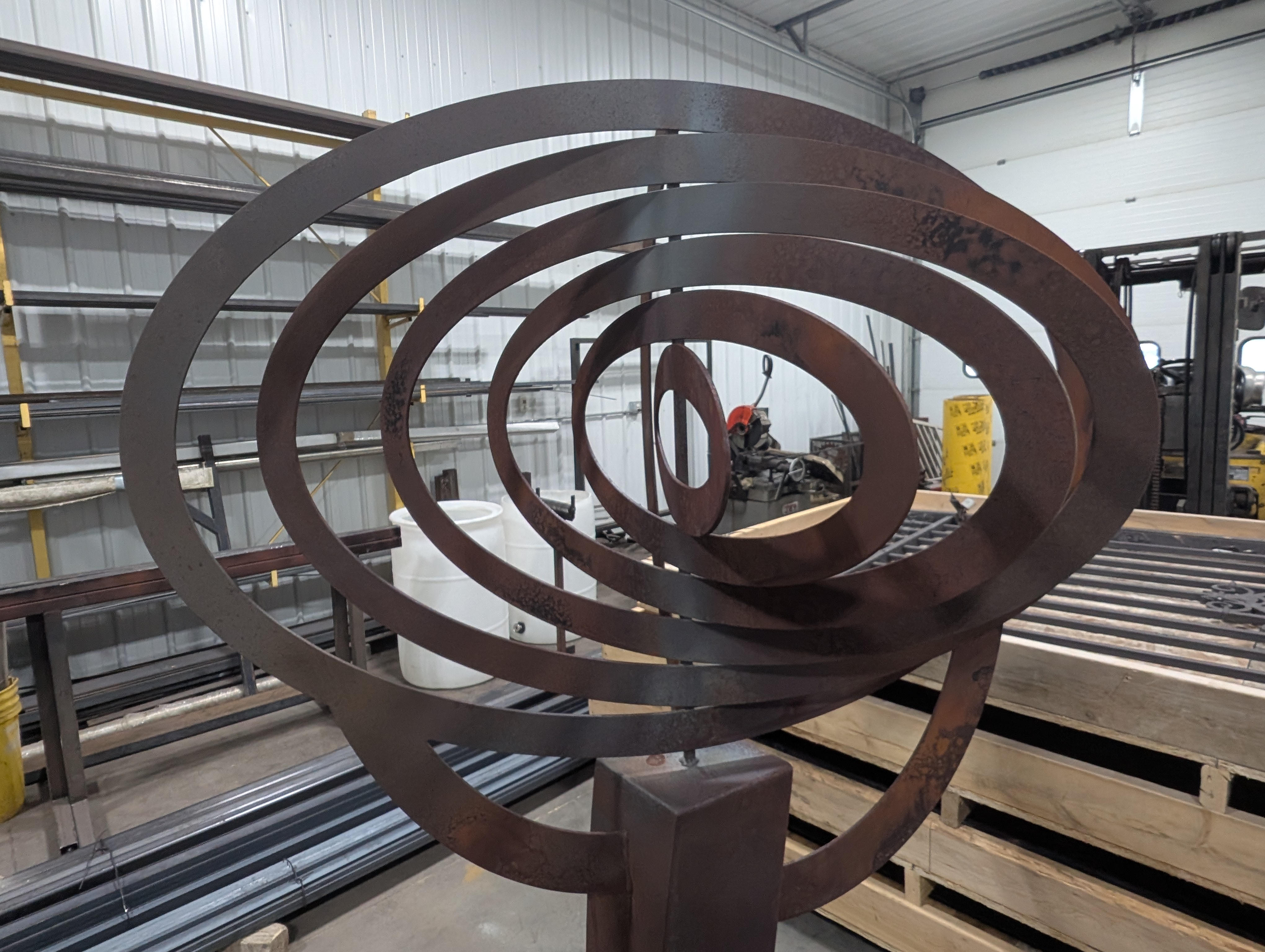 Orbital[1] is a completely fixed 4' x 6' Cor10 steel sculpture. John Goupell, artist and designer, is fixated with forms. Each one of his sculptures starts with a kernel of an idea(form) and then that seed expands into the art itself. Orbital[1] started with the kernel of the orbital oval piece then multiplied and shifted to the sculpture you see.